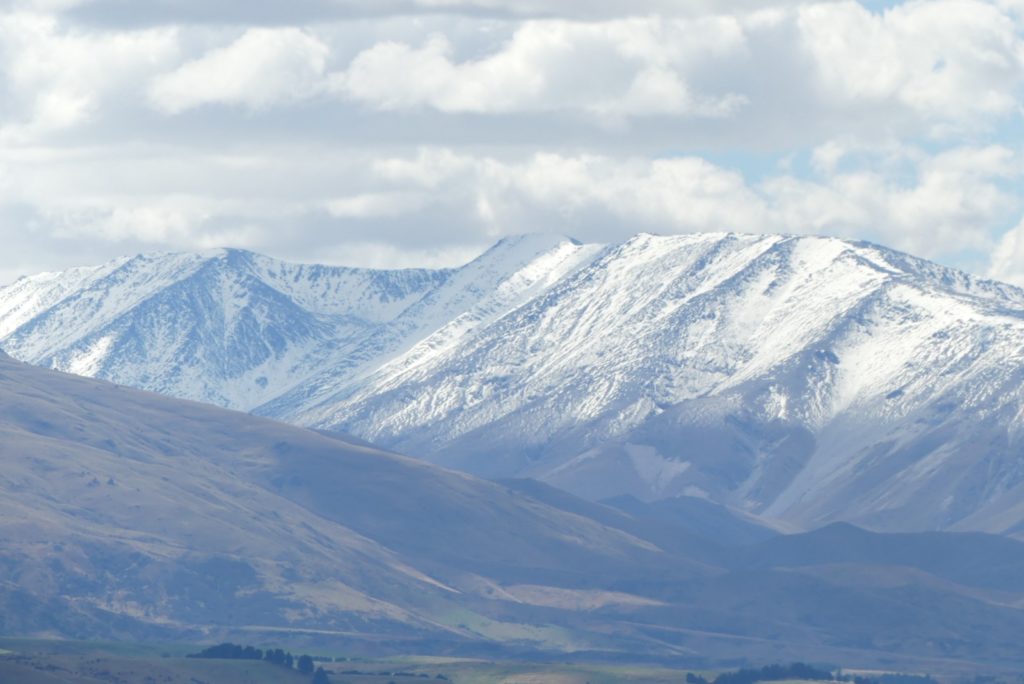 Schneebedeckte Bergspitzen entlang des Trails am sonnigen Donnerstagmorgen. Der Wintereinbruch der letzten Tage hat alle Gipfel über 1000 m gepudert. Weiße Berge über dunklen Hängen unter blauem Himmel sind typisch für Otago, aber nicht im Hochsommer. Das Land zeigt seine Schönheit im Extremen.