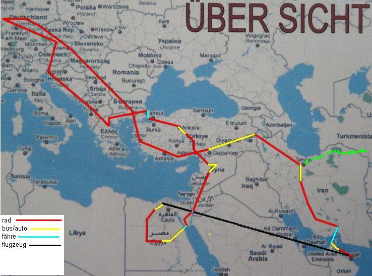 ca. 10.000 km mit bus, auto, flugzeug und fähren 301 tage unterwegs, davon 179 alleine unterwegs, 68 mit Markus, 54 mit dritten* 161 radtage, davon 129 alleine, 29 mit Markus, 3 mit dritten* 131 pausentage, davon 31 alleine, 33 mit Markus, 49 mit dritten* 27 transittage•, davon 19 alleine, 6 mit Markus, 2 mit dritten* *Elvira, Saskia, Sara und zufällig getroffene radler •Flug-, Fähren-, Bus-, Taxi-Tage, Tage in Botschaften,Busstationen oder Fährhäfen |