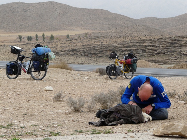 Der himmel ist heute grau und verhangen. Aber noch sieht es nicht nach regen aus. Die straße schaukelt ein wenig auf und ab richtung Shiraz. 60 km sind’s noch, als Max an einem unter der straße hindurch führenden ausgetrockneten wasserlauf voller abfälle einen blonden welpen entdeckt. Neben ihm schon starr und kalt seine tote anscheinend überfahrene mutter.